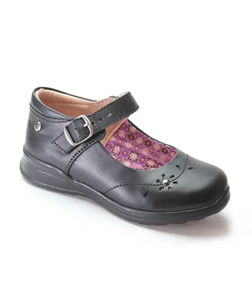 Calzado escolar de cuero negro lustrable para fácil limpieza. Cincho de trabita ajustable para mayor seguridad y comodidad, forros transpirables y una plantilla de memory foam 3mm color rosado.