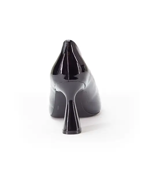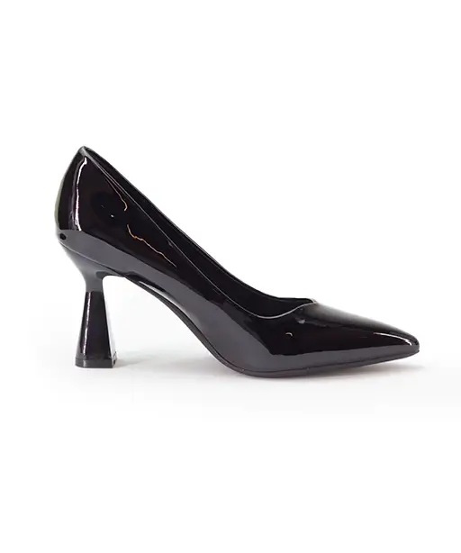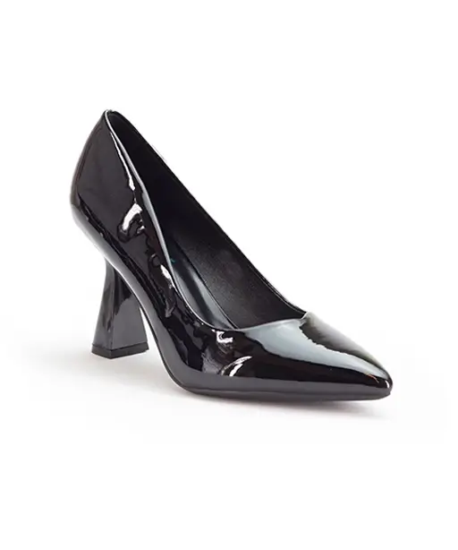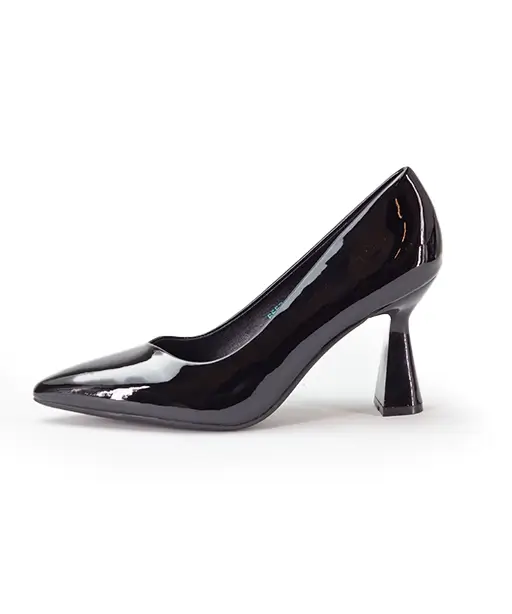 Este zapato de tacón en acabado charol negro es el complemento perfecto para graduaciones, convivios, eventos formales o una noche especial. Su diseño de punta fina estiliza la silueta del pie, mientras que el tacón ancho y geométrico brinda estabilidad y comodidad durante largas horas.